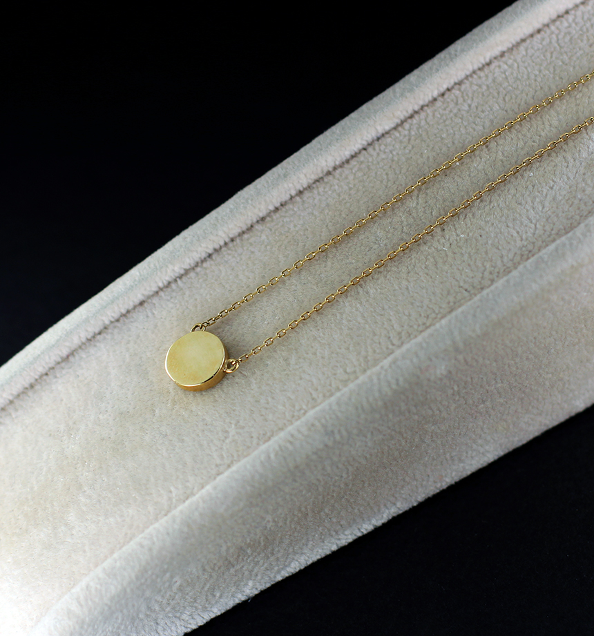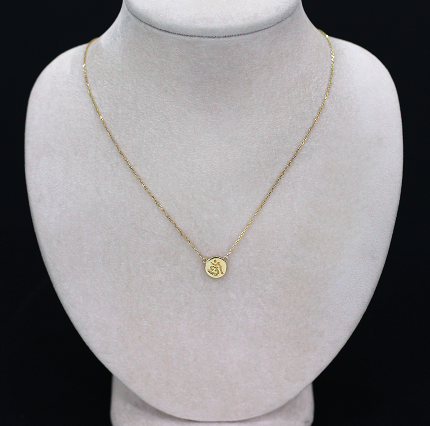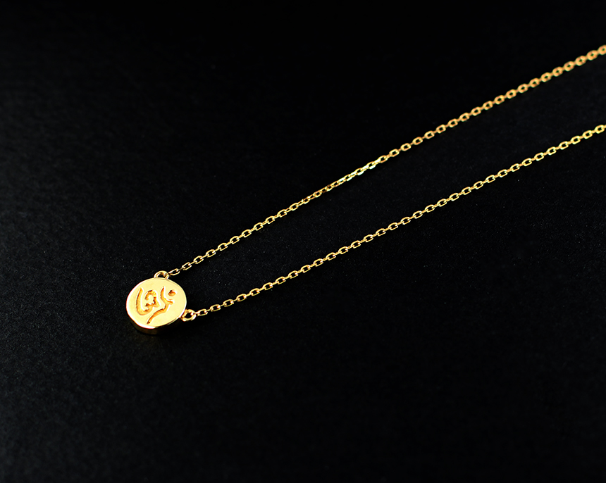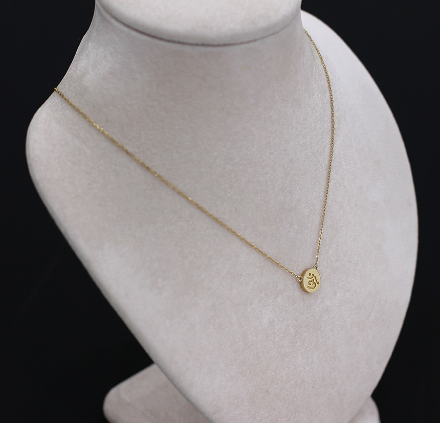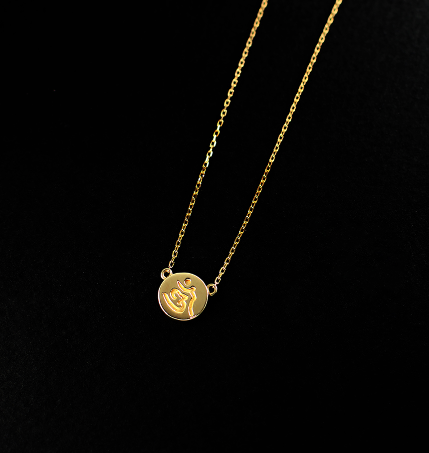 둥근 원판 모양의 펜던트에 " 옴" 자 모양이 음각으로 표현 된 불교 목걸이